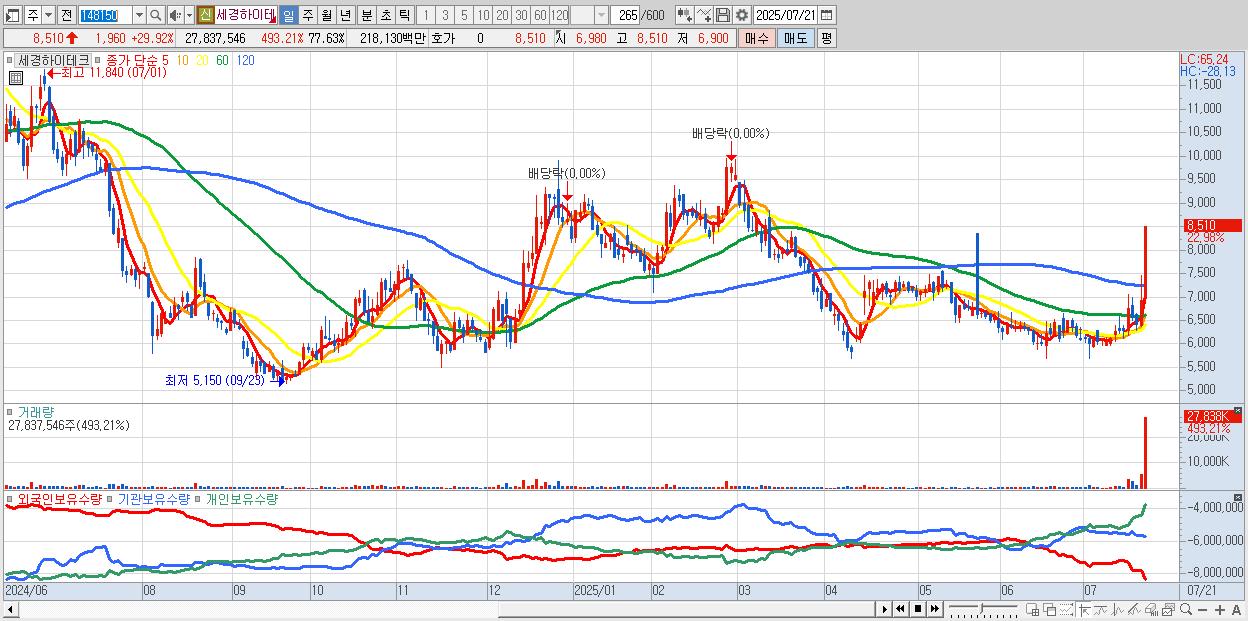 - 세경하이테크 (8,510원 ▲ 29.92% , 시총: 3,052억, 거래량: 13,219,442, 거래대금:1,045억)