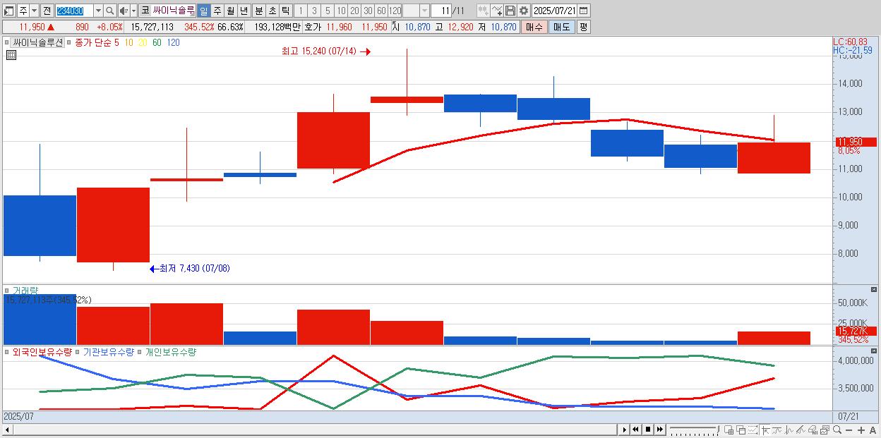 - 싸이닉솔루션 (11,950원 ▲ 8.05% , 시총: 2,821억, 거래량: 15,727,113, 거래대금:1,931억)