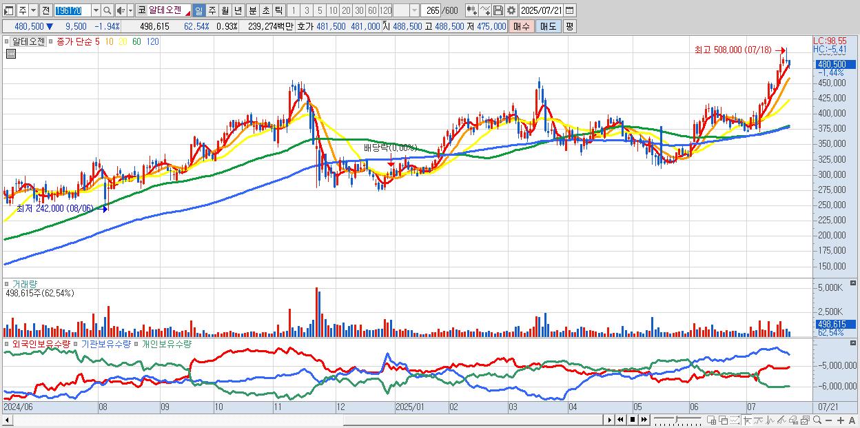 - 알테오젠 (483,000원 ▼ -1.43% , 시총: 258,236억, 거래량: 268,393, 거래대금:1,287억)