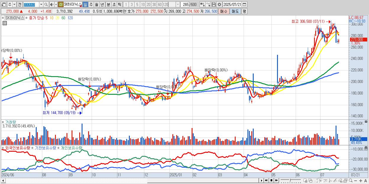 - SK하이닉스 (272,500원 ▲ 1.3% , 시총: 1,983,806억, 거래량: 2,424,891, 거래대금:6,592억)