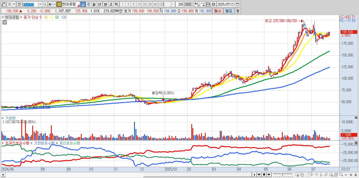 - 현대로템 (199,800원 ▲ 2.83% , 시총: 218,066억, 거래량: 726,631, 거래대금:1,442억)