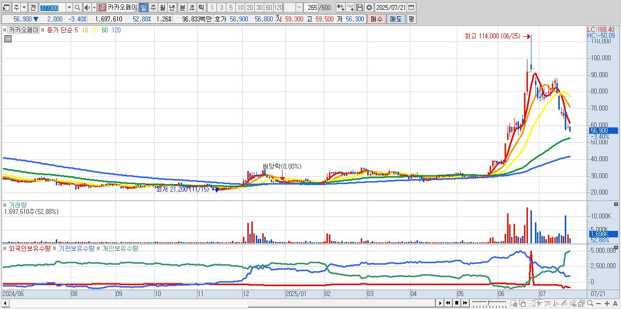 - 카카오페이 (56,900원 ▼ -3.4% , 시총: 76,810억, 거래량: 1,697,610, 거래대금:968억)