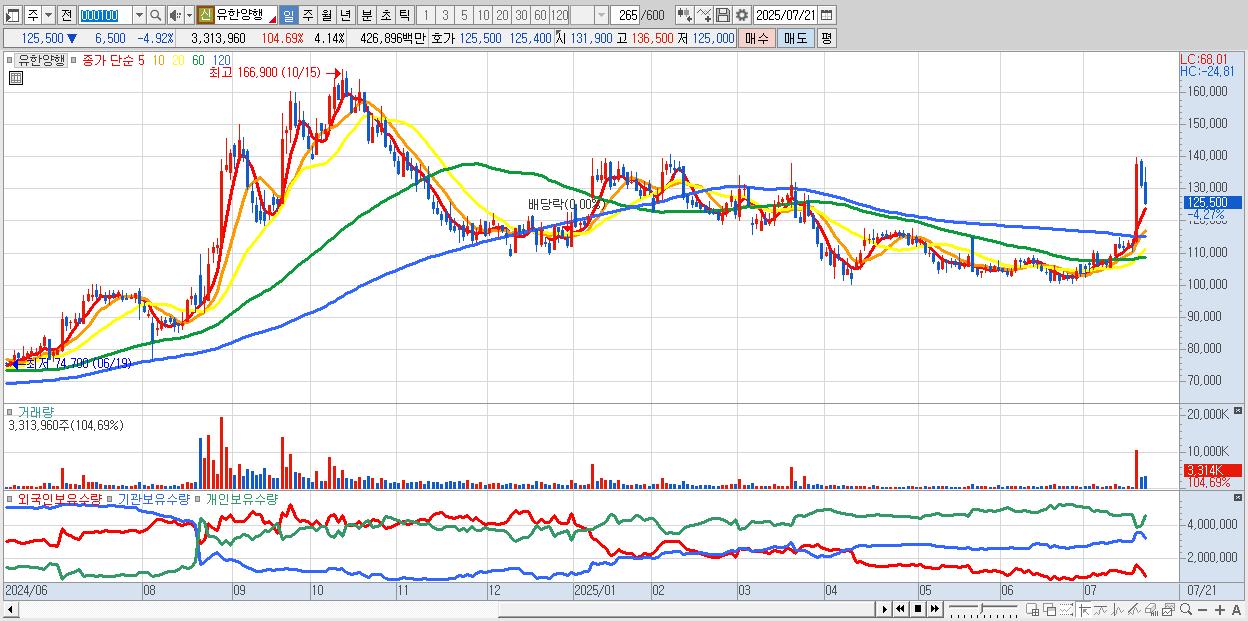 - 유한양행 (125,900원 ▼ -4.62% , 시총: 100,680억, 거래량: 1,532,486, 거래대금:1,954억)