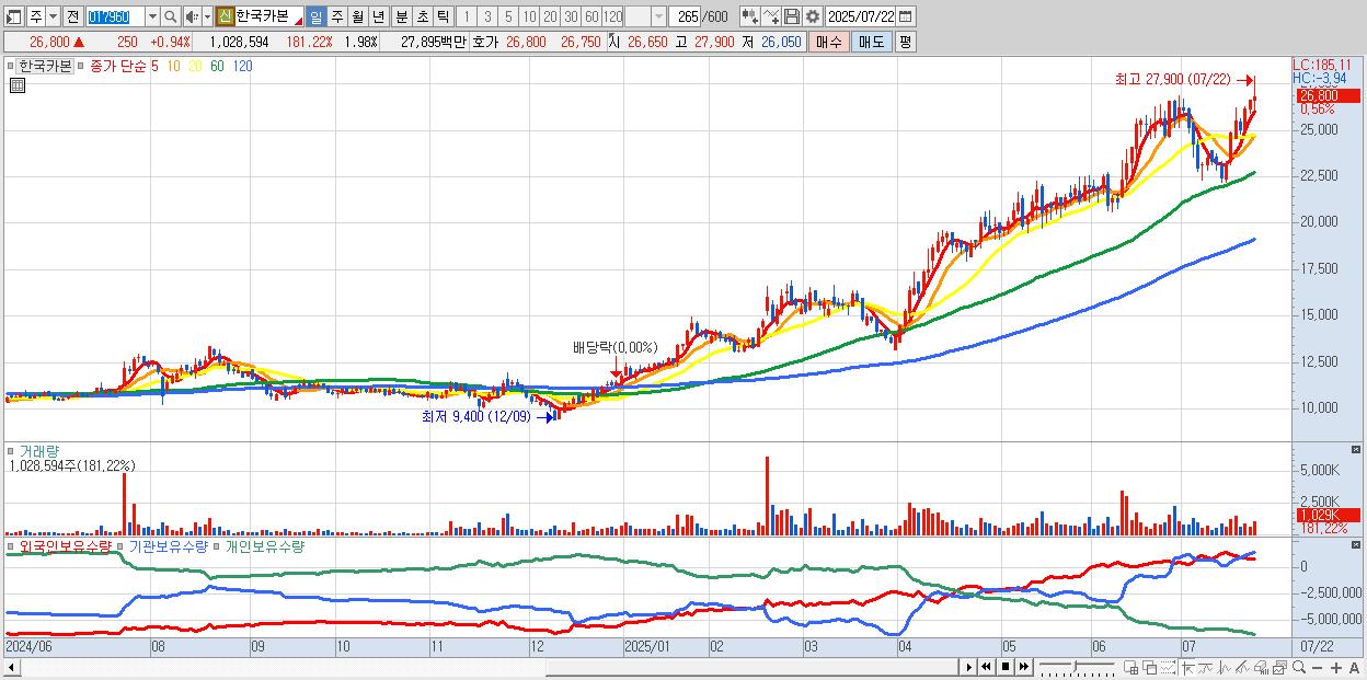 - 한국카본 (27,000원 ▲ 1.69% , 시총: 14,015억, 거래량: 711,235, 거래대금:193억, KOSPI)