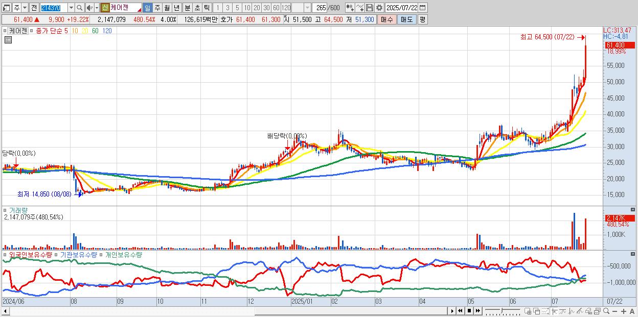 - 케어젠 (59,000원 ▲ 14.56% , 시총: 31,692억, 거래량: 834,277, 거래대금:485억, KOSDAQ)