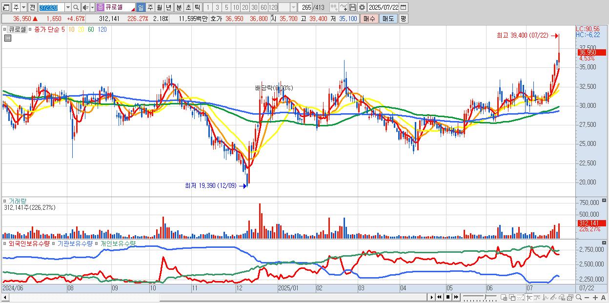 - 큐로셀 (36,550원 ▲ 3.54% , 시총: 5,235억, 거래량: 172,277, 거래대금:64억, KOSDAQ)