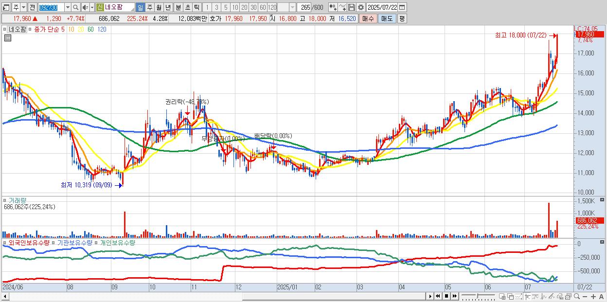 - 네오팜 (17,960원 ▲ 7.74% , 시총: 2,879억, 거래량: 686,062, 거래대금:121억, KOSDAQ)