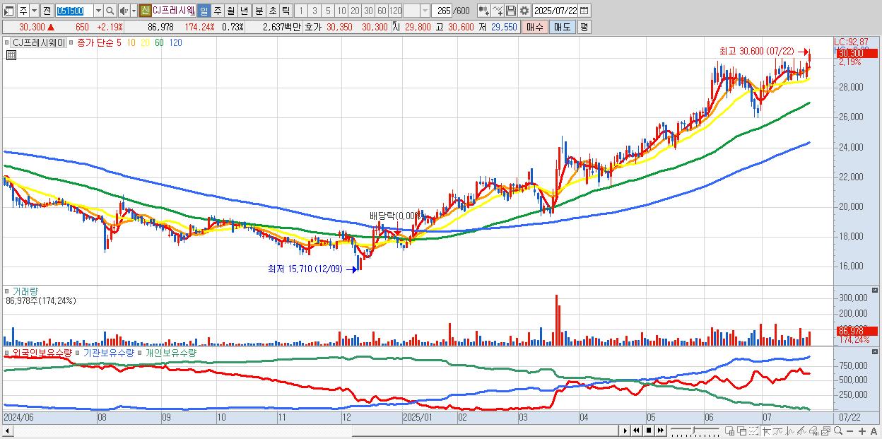 - CJ프레시웨이 (30,300원 ▲ 2.19% , 시총: 3,597억, 거래량: 86,978, 거래대금:26억, KOSDAQ)