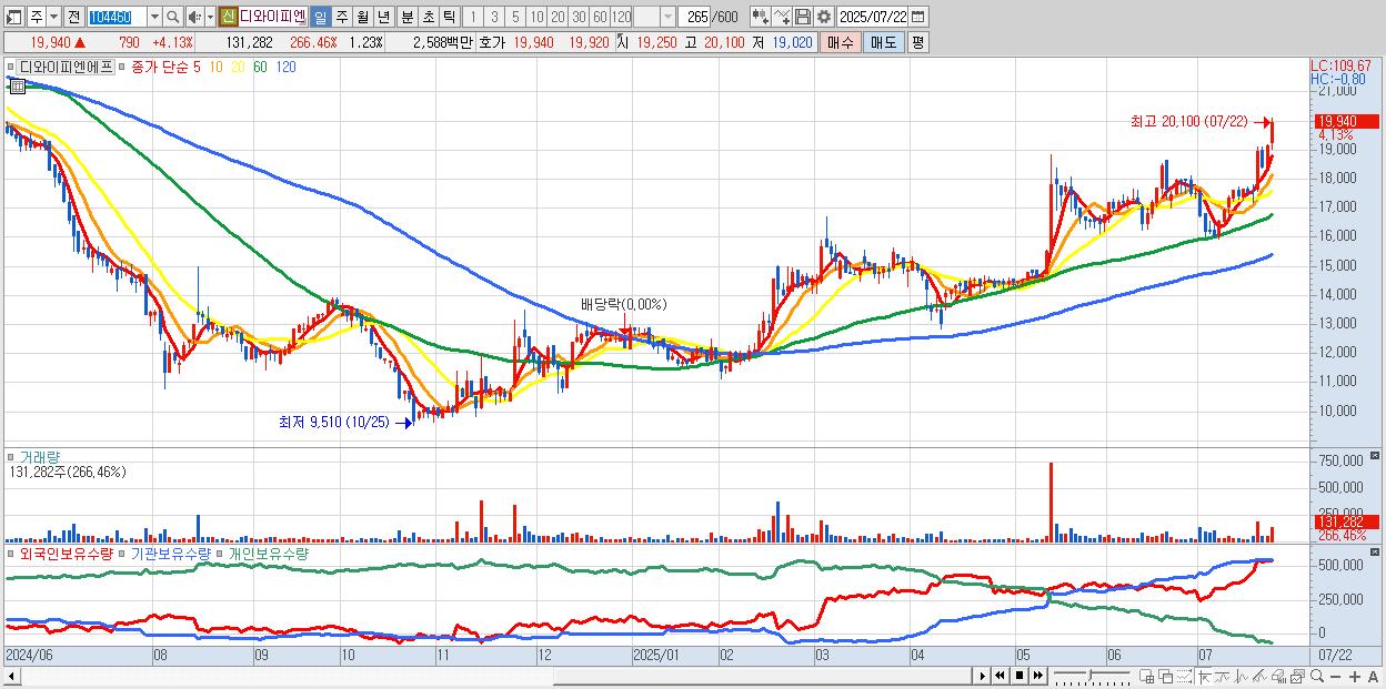 - 디와이피엔에프 (19,940원 ▲ 4.13% , 시총: 2,136억, 거래량: 131,282, 거래대금:26억, KOSDAQ)