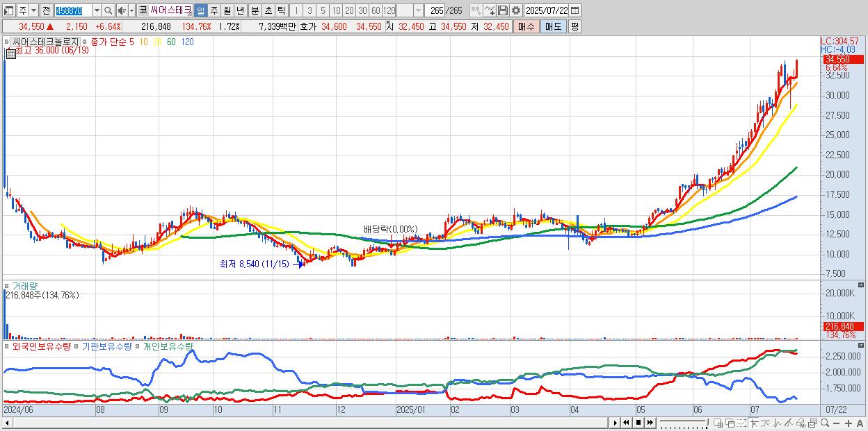 - 씨어스테크놀로지 (34,550원 ▲ 6.64% , 시총: 4,350억, 거래량: 216,848, 거래대금:73억, KOSDAQ)