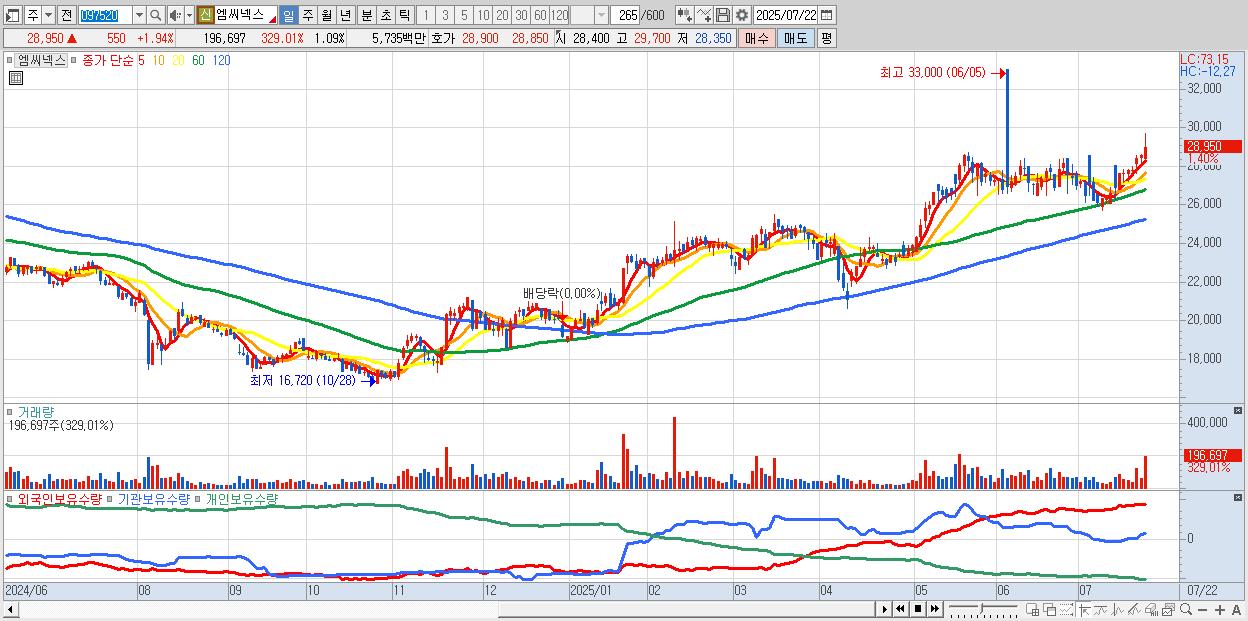 - 엠씨넥스 (28,900원 ▲ 1.76% , 시총: 5,196억, 거래량: 108,101, 거래대금:31억, KOSPI)
