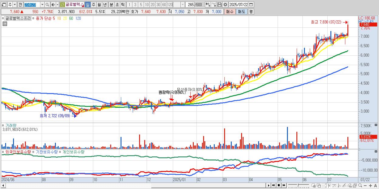 - 글로벌텍스프리 (7,670원 ▲ 8.18% , 시총: 5,391억, 거래량: 2,742,036, 거래대금:207억, KOSDAQ)