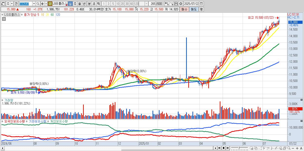 - LG유플러스 (15,120원 ▲ 1.34% , 시총: 66,016억, 거래량: 1,635,508, 거래대금:247억, KOSPI)