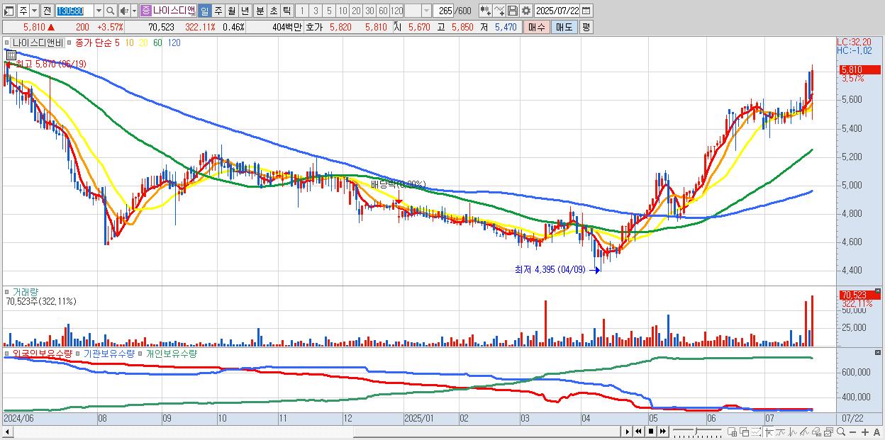 - 나이스디앤비 (5,810원 ▲ 3.57% , 시총: 895억, 거래량: 70,523, 거래대금:4억, KOSDAQ)