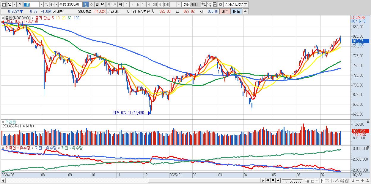| 07/15 | 812.88 | ▲1.69% | -462억 | 698억 | -169억 | -67억 |