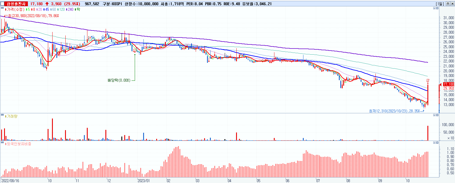 - 삼성출판사 (17,180원 ▲ 29.95% , 시총: 1,718억, 거래량: 969,073, 거래대금:160억)