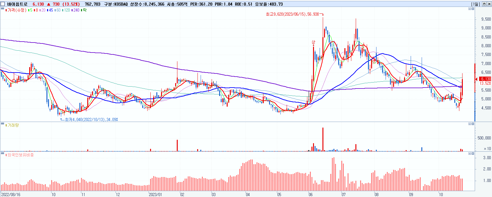 - 바이옵트로 (6,130원 ▲ 13.52% , 시총: 505억, 거래량: 781,614, 거래대금:46억)