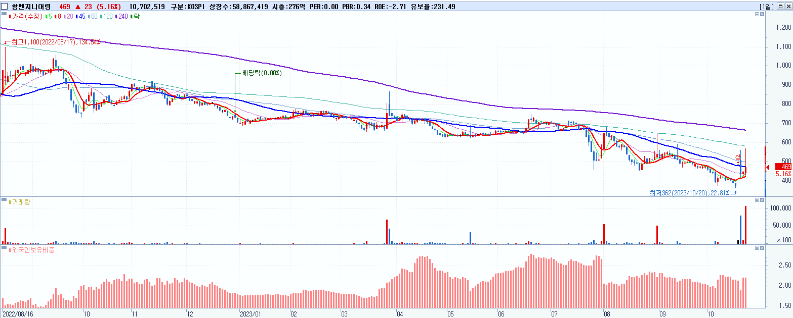 - 참엔지니어링 (469원 ▲ 5.16% , 시총: 276억, 거래량: 11,219,131, 거래대금:57억)
