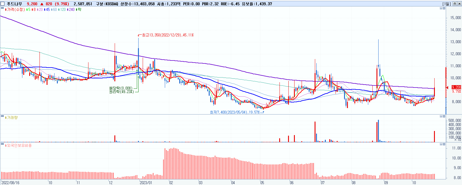 - 푸드나무 (9,200원 ▲ 9.79% , 시총: 1,233억, 거래량: 2,597,538, 거래대금:245억)