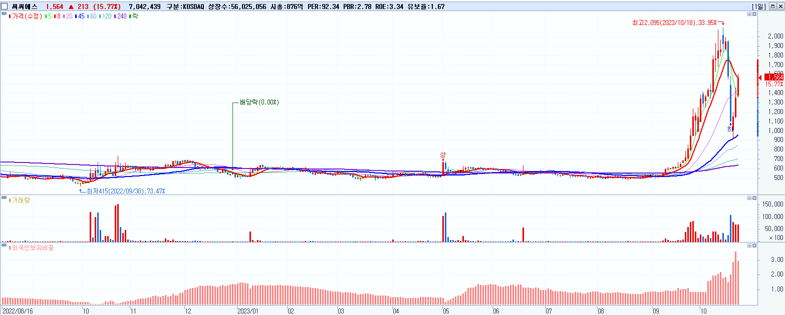 - 씨씨에스 (1,564원 ▲ 15.77% , 시총: 876억, 거래량: 7,067,546, 거래대금:109억)