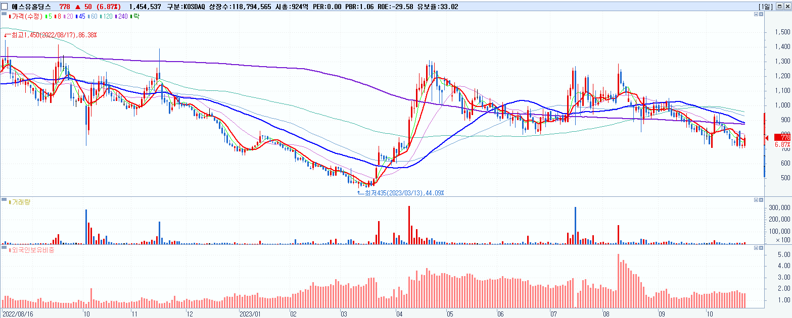 - 에스유홀딩스 (778원 ▲ 6.87% , 시총: 924억, 거래량: 1,455,188, 거래대금:11억)