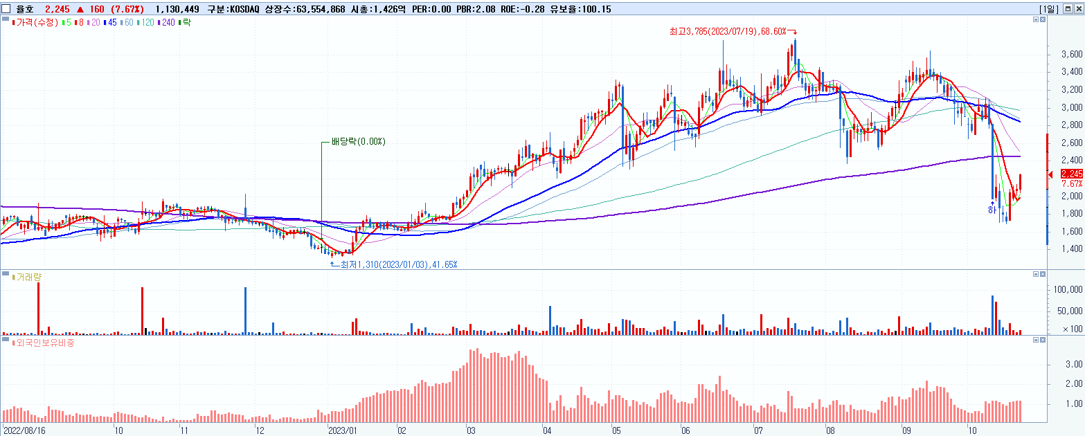 - 율호 (2,245원 ▲ 7.67% , 시총: 1,427억, 거래량: 1,134,173, 거래대금:25억)