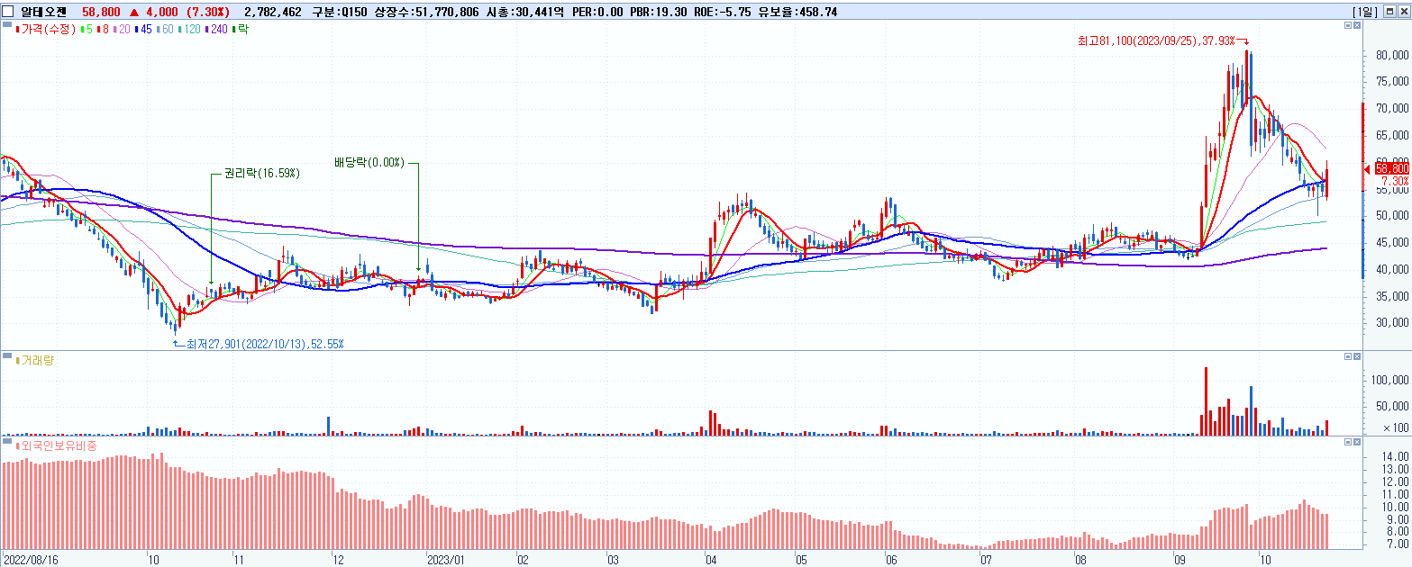 - 알테오젠 (58,800원 ▲ 7.3% , 시총: 30,441억, 거래량: 2,802,828, 거래대금:1,632억)