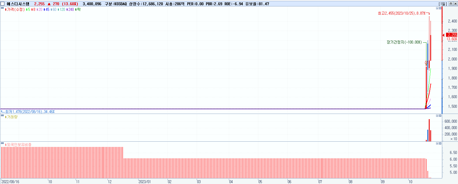- 에스디시스템 (2,255원 ▲ 13.6% , 시총: 286억, 거래량: 3,415,922, 거래대금:77억)