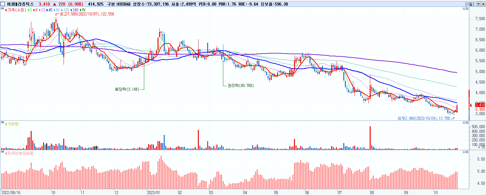 - HLB테라퓨틱스 (3,410원 ▲ 6.9% , 시총: 2,500억, 거래량: 415,984, 거래대금:14억)