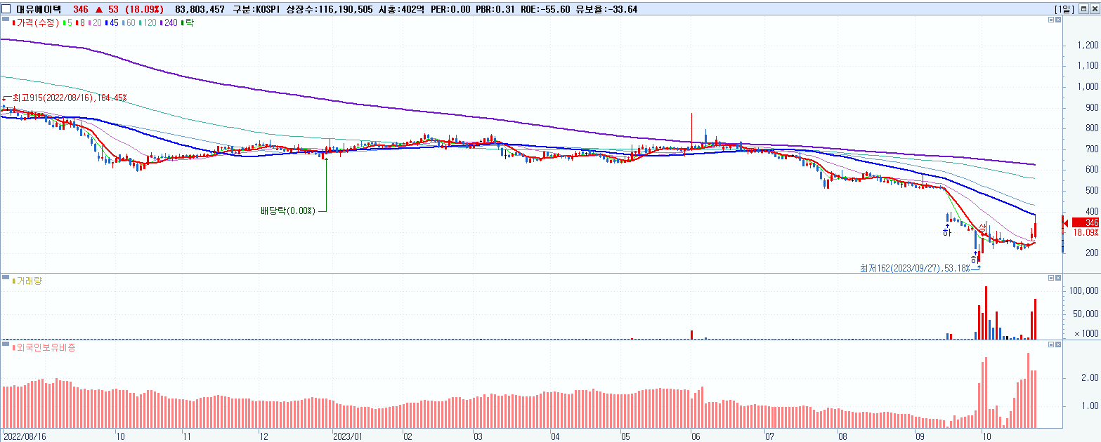 - 대유에이텍 (346원 ▲ 18.09% , 시총: 402억, 거래량: 84,850,785, 거래대금:297억)
