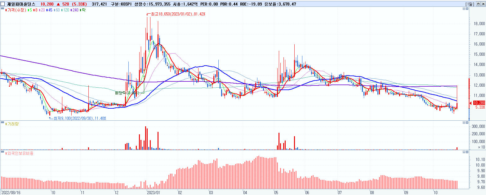 - 제일파마홀딩스 (10,280원 ▲ 5.33% , 시총: 1,642억, 거래량: 318,741, 거래대금:35억)