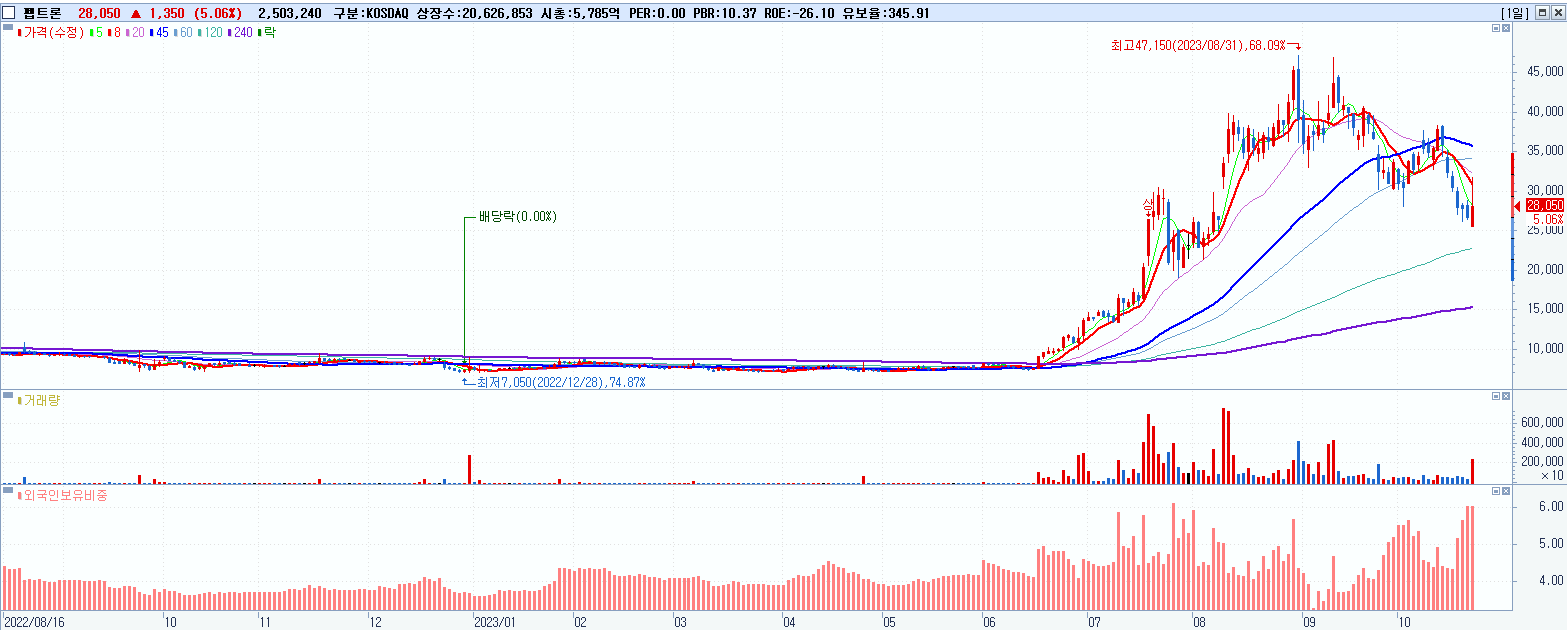 - 펩트론 (28,050원 ▲ 5.06% , 시총: 5,786억, 거래량: 2,510,035, 거래대금:720억)