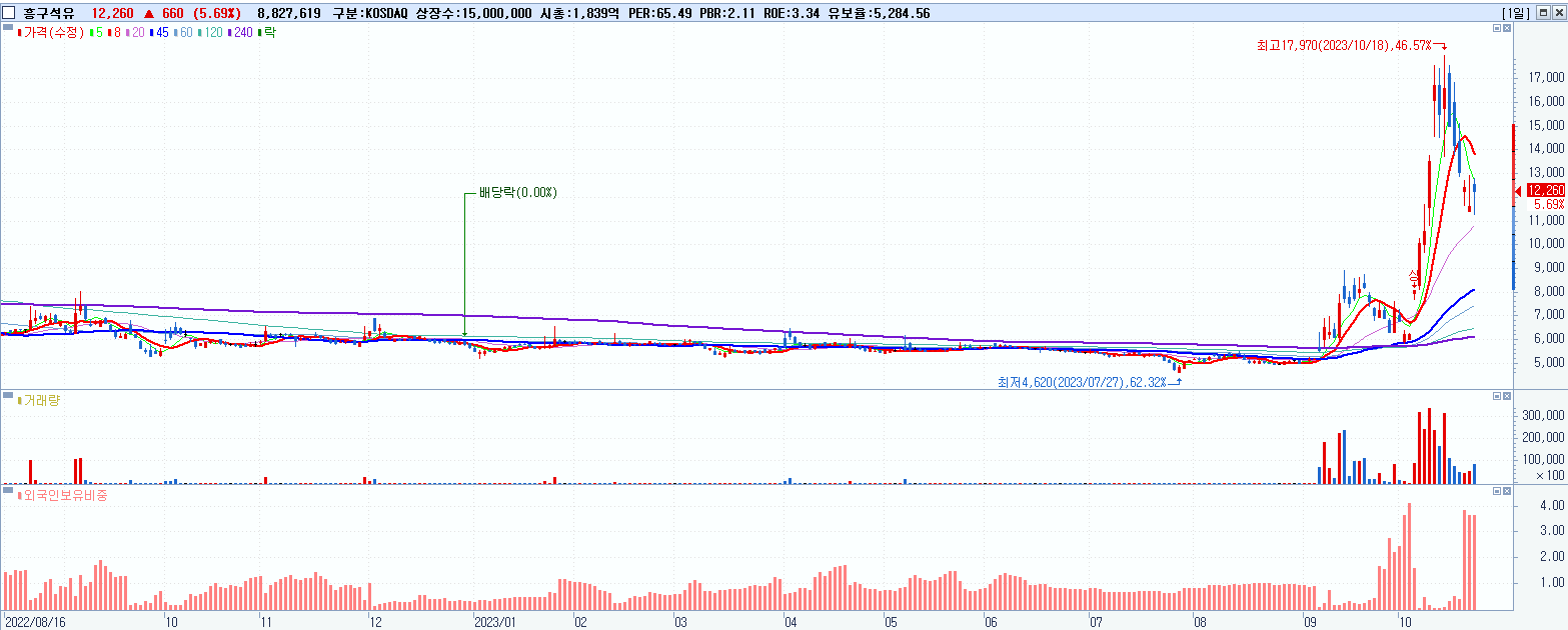 - 흥구석유 (12,260원 ▲ 5.69% , 시총: 1,839억, 거래량: 8,908,643, 거래대금:1,080억)