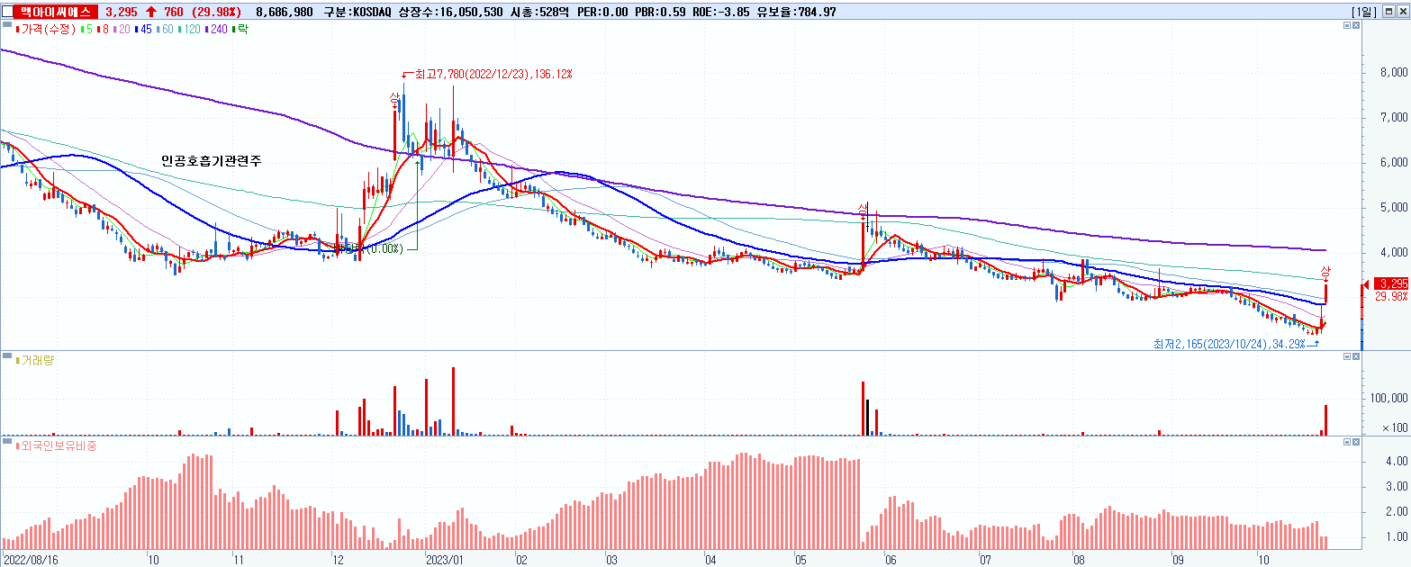 - 멕아이씨에스 (3,295원 ▲ 29.98% , 시총: 529억, 거래량: 8,692,095, 거래대금:282억)