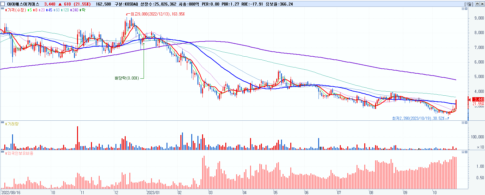 - 아이에스이커머스 (3,440원 ▲ 21.55% , 시총: 888억, 거래량: 192,119, 거래대금:6억)