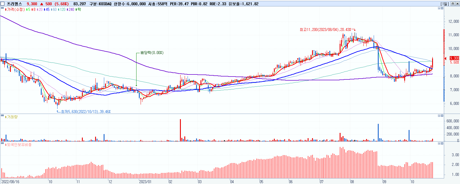 - 프리엠스 (9,300원 ▲ 5.68% , 시총: 558억, 거래량: 83,273, 거래대금:8억)