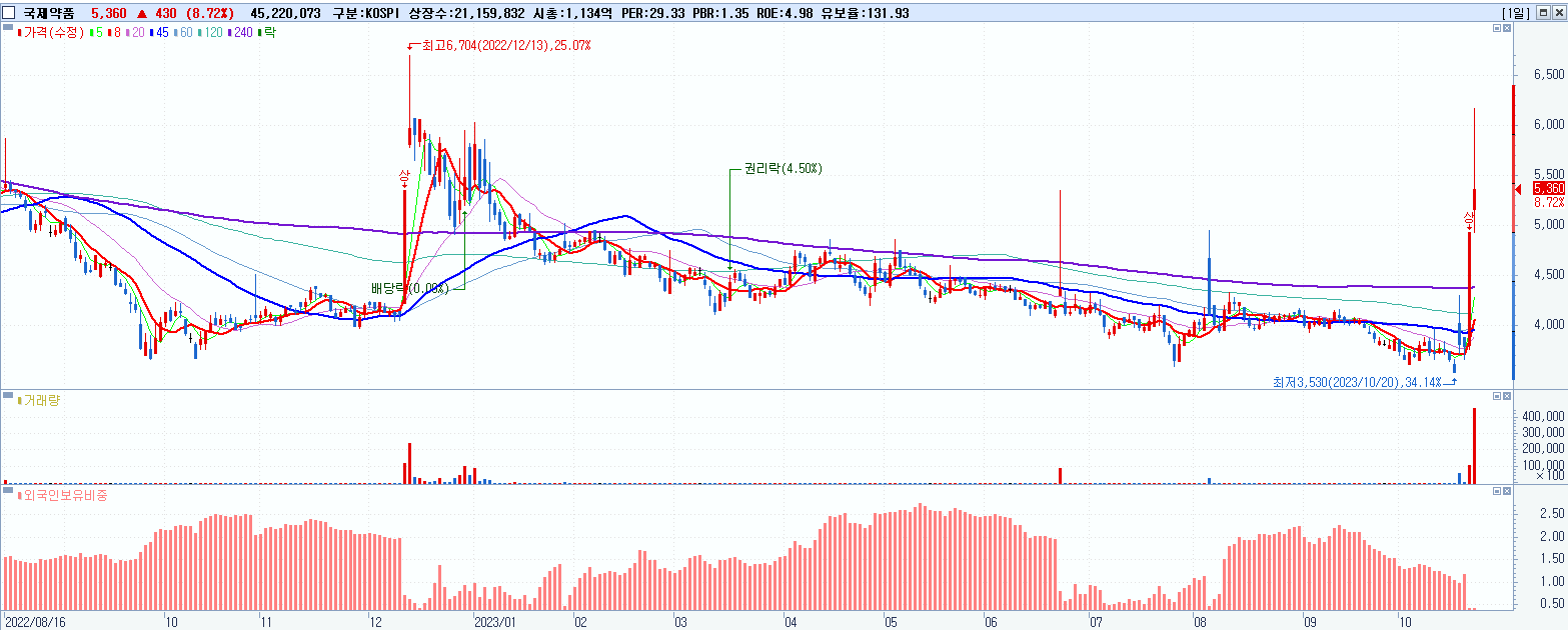 - 국제약품 (5,360원 ▲ 8.72% , 시총: 1,134억, 거래량: 45,930,698, 거래대금:2,552억)