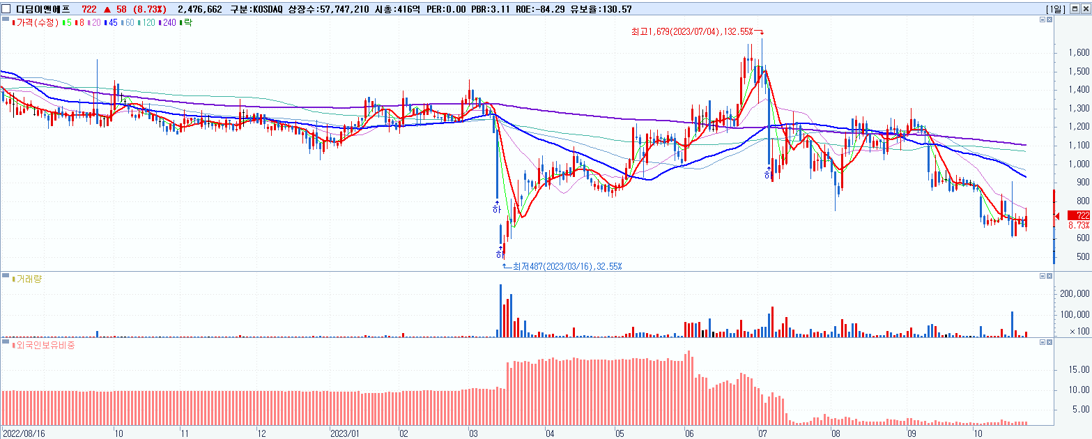 - 디딤이앤에프 (722원 ▲ 8.73% , 시총: 417억, 거래량: 2,485,988, 거래대금:18억)