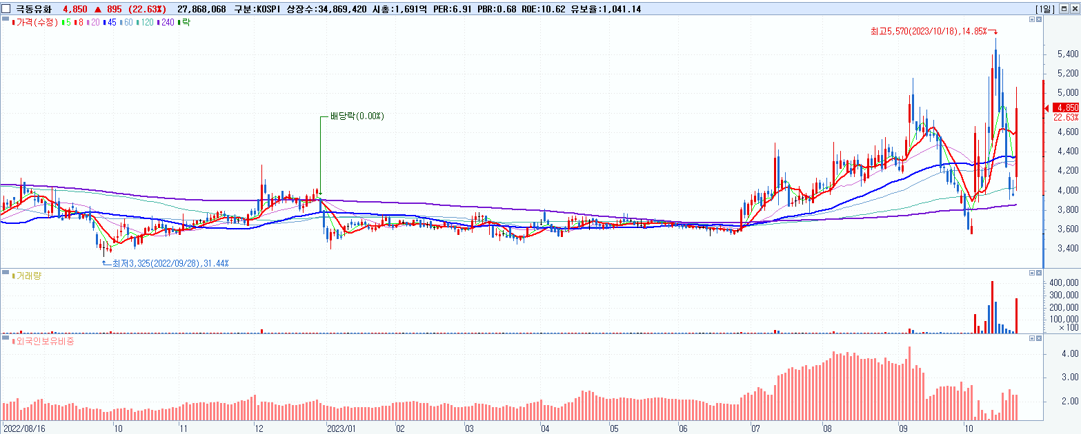 4.극동유화 4,850원 ▲ 22.63% (KOSPI, 014530)
