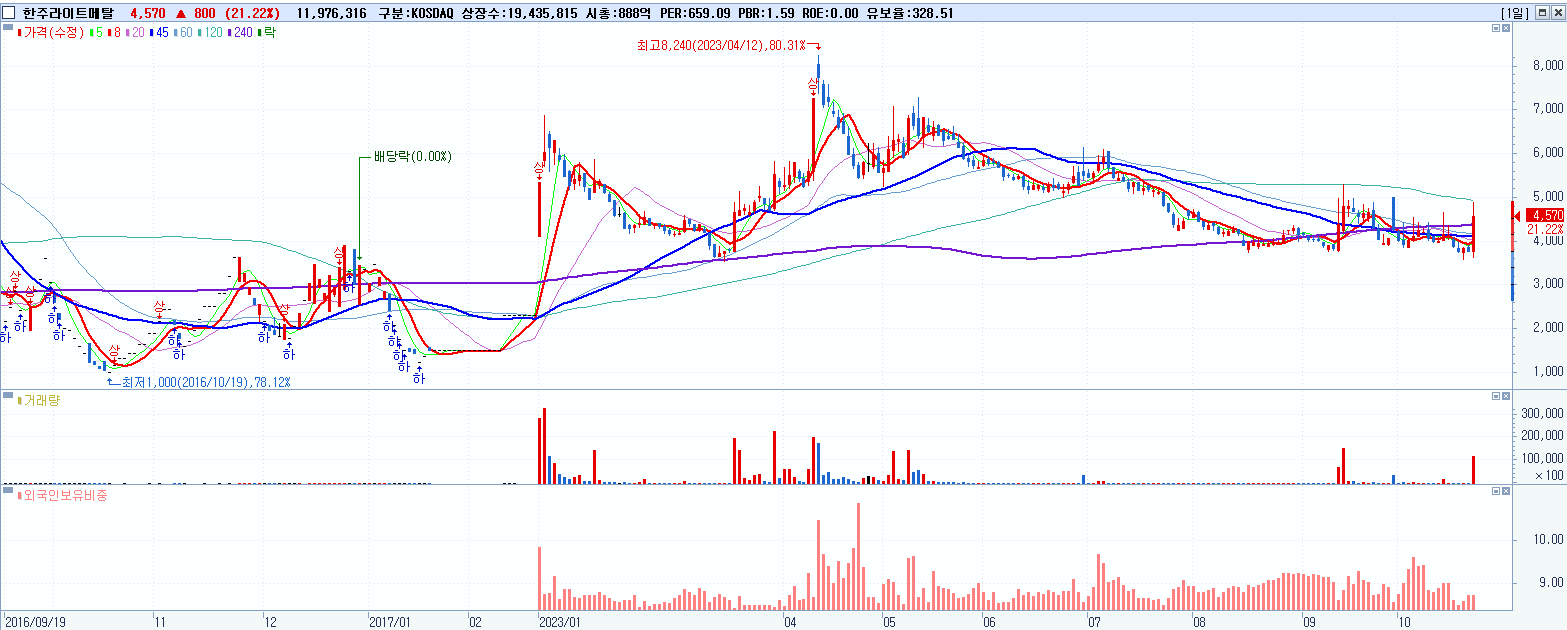 - 한주라이트메탈 (4,570원 ▲ 21.22% , 시총: 888억, 거래량: 12,489,610, 거래대금:572억)
