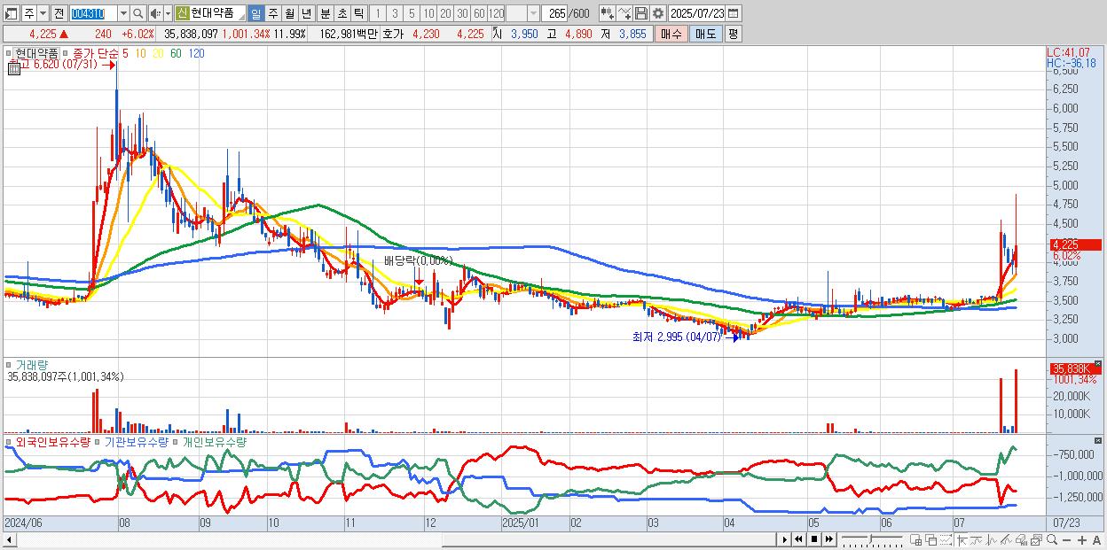 - 현대약품 (4,225원 ▲ 6.02% , 시총: 1,352억, 거래량: 35,838,097, 거래대금:1,630억)