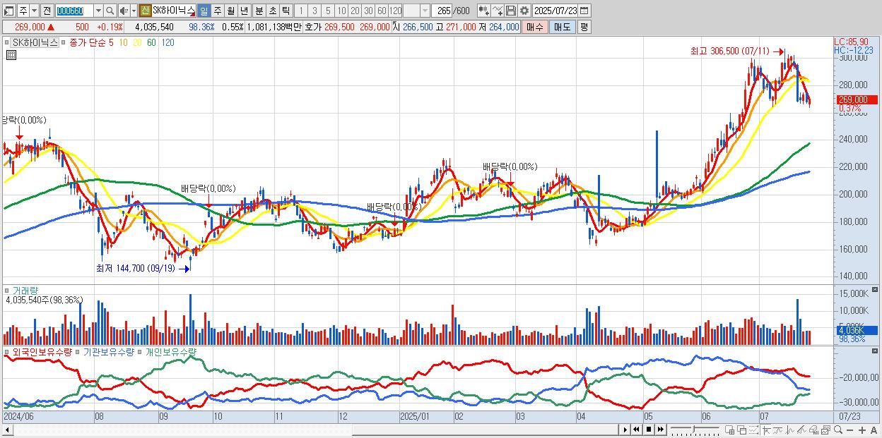 - SK하이닉스 (269,000원 ▲ 0.19% , 시총: 1,958,326억, 거래량: 3,116,279, 거래대금:8,353억)