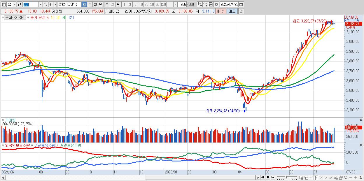 07/10 | 3,183.23 | ▲1.58% | -5,869억 | 4,694억 | 447억 | 728억 |