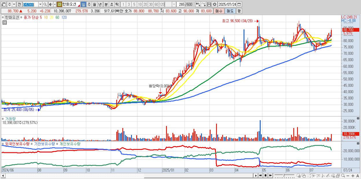 - 한화오션 (88,800원 ▲ 6.35% , 시총: 272,095억, 외국인 순매수 거래금:2,281억)