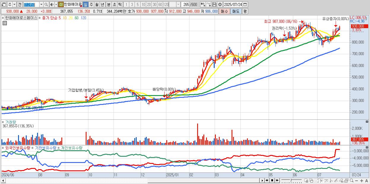 - 한화에어로스페이스 (941,000원 ▲ 3.41% , 시총: 485,212억, 외국인 순매수 거래금:415억)
