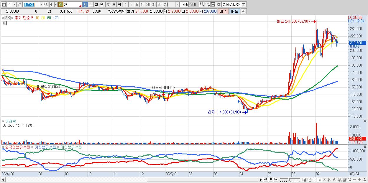 - SK (211,000원 ▲ 0.24% , 시총: 152,981억, 외국인 순매수 거래금:205억)