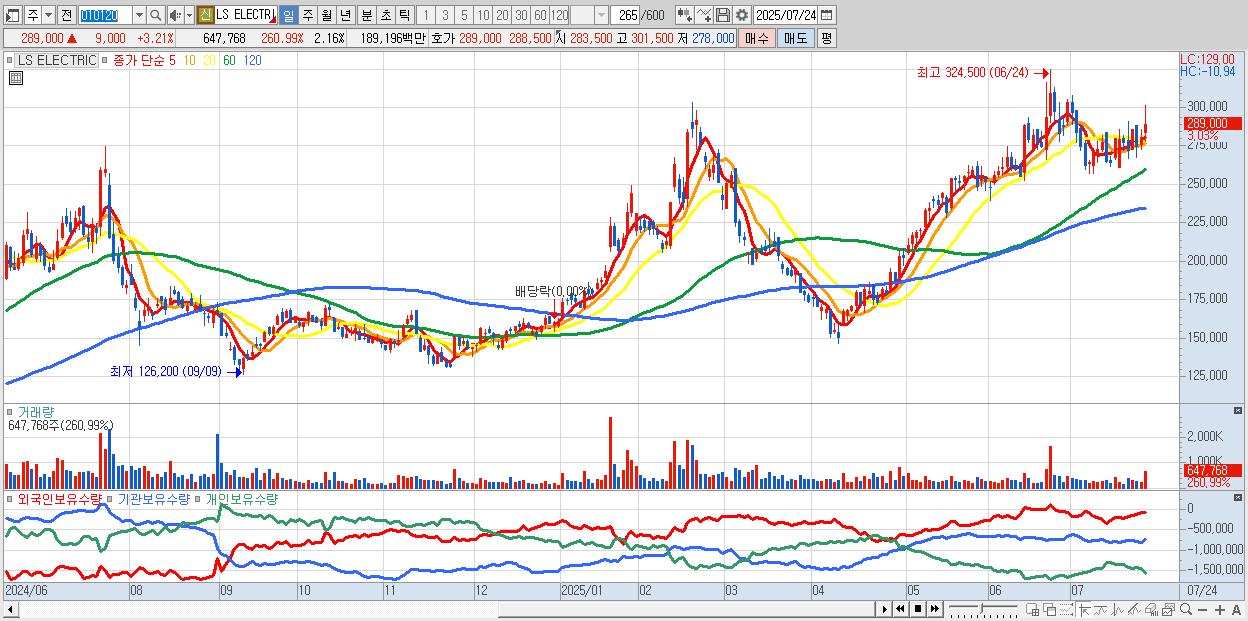 - LS ELECTRIC (289,000원 ▲ 3.21% , 시총: 86,700억, 외국인 순매수 거래금:215억)