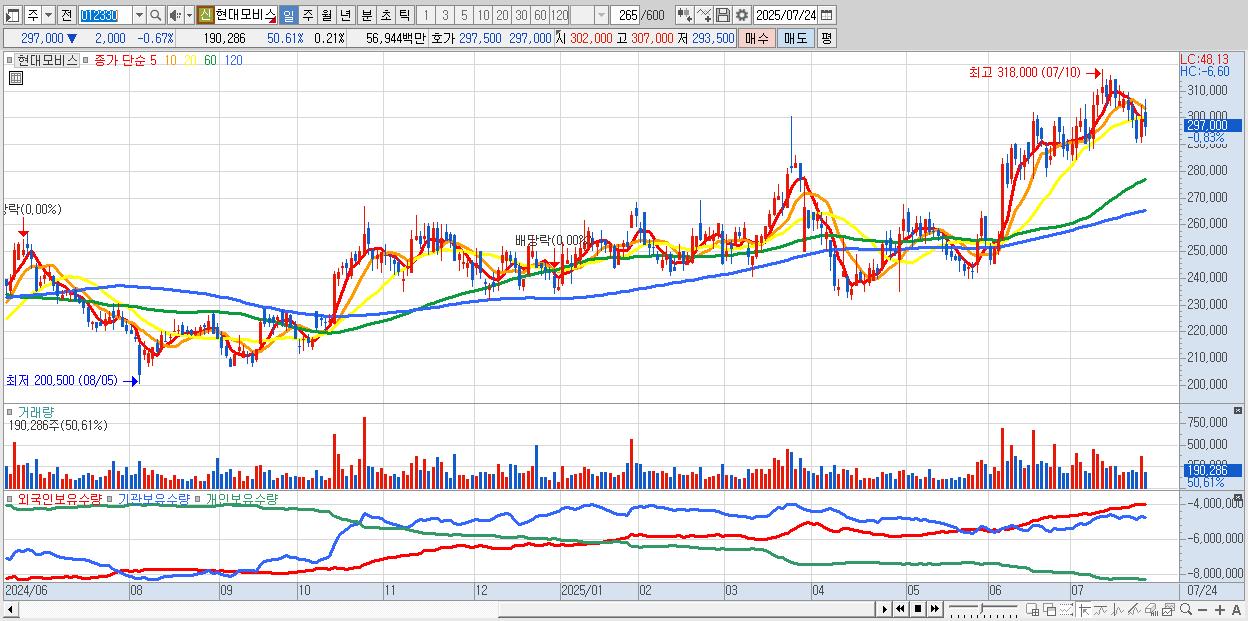 - 현대모비스 (296,000원 ▼ -1% , 시총: 271,713억, 외국인 순매수 거래금:119억)