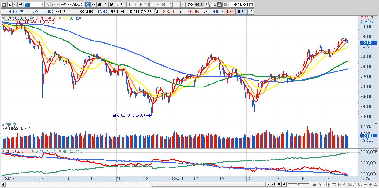 | 07/11 | 800.47 | ▲0.35% | -618억 | 518억 | 145억 | -45억 |