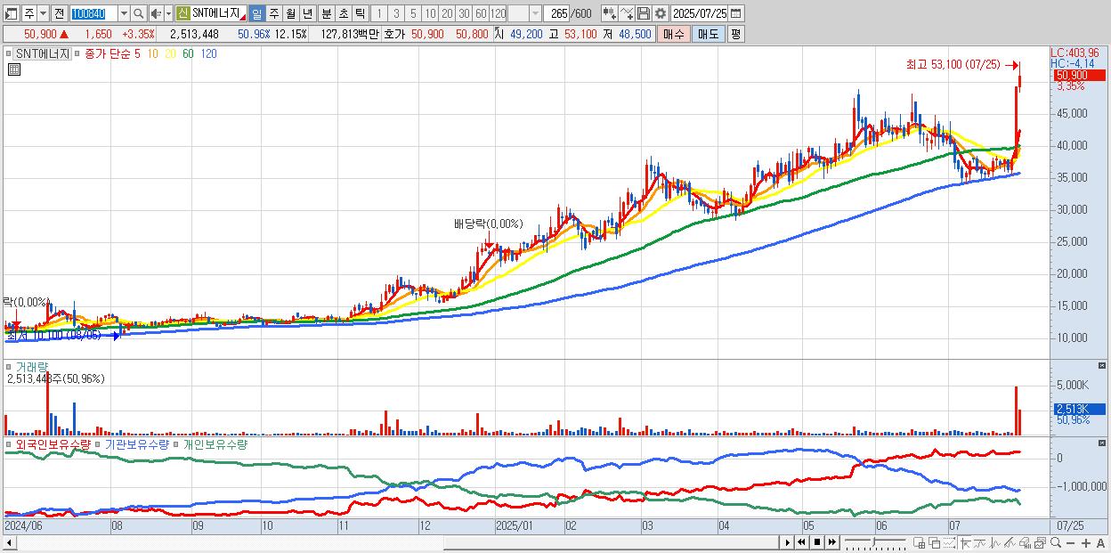 - SNT에너지 (51,500원 ▲ 4.57% , 시총: 10,651억, 외국인 순매수 거래금:89억)